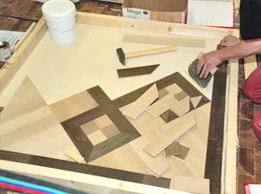 To realize the varying pattern template. the parquet was prepared in advance: The head springs of the two layer rods were removed. After that the rods were also grooved at the side of the springs. Now the parquet can be layed in every direction and conventional rod parquet can be produced. For better gearing the participants got loose springs, which could be cut and processed individually. After laying the adhesives the surface is being polished and oiled.